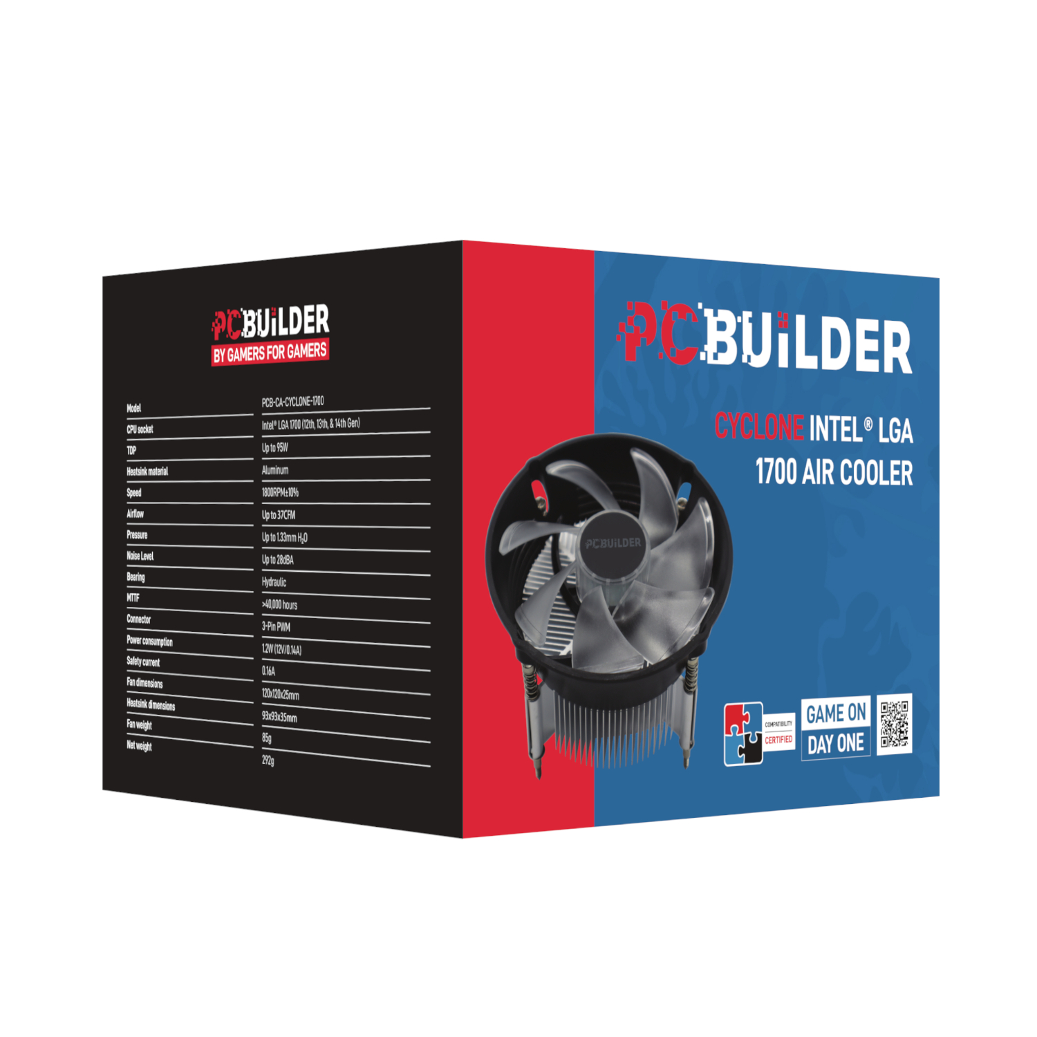 The PCBuilder CYCLONE Intel® LGA 1700 Air Cooler is designed to be compatible with the latest Intel ® LGA 1700 CPU sockets (12th, 13th, and 14th Gen). This fan is specifically designed to deliver optimal cooling performance for these powerful processors, ensuring they operate efficiently even under heavy workloads. Whether you’re building a new system or upgrading your current setup, the CYCLONE is the perfect choice to keep your CPU cool and maintain peak performance. With its sleek design and powerful airflow, this computer cooling fan allows you to focus on your tasks without interruptions, making it an essential addition to any Intel® LGA 1700 build.