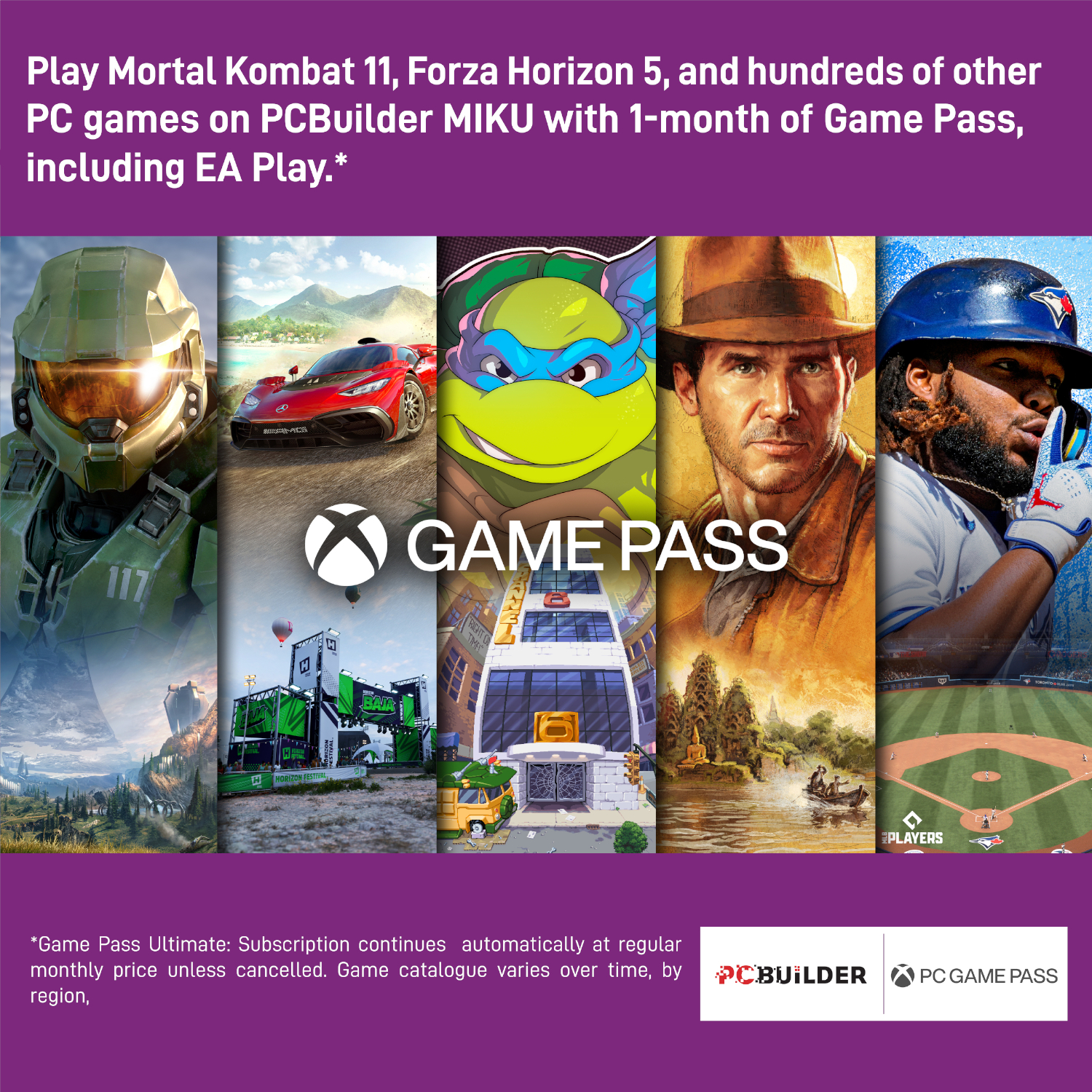 - Play over 100 high-quality PC games like Halo Infinite, Forza Horizon 5 and Teenage Mutant Ninja Turtles: Shredder’s Revenge with your new build and one month of PC Game Pass including EA Play. With new games being added all the time, there’s always something new to play from day one.